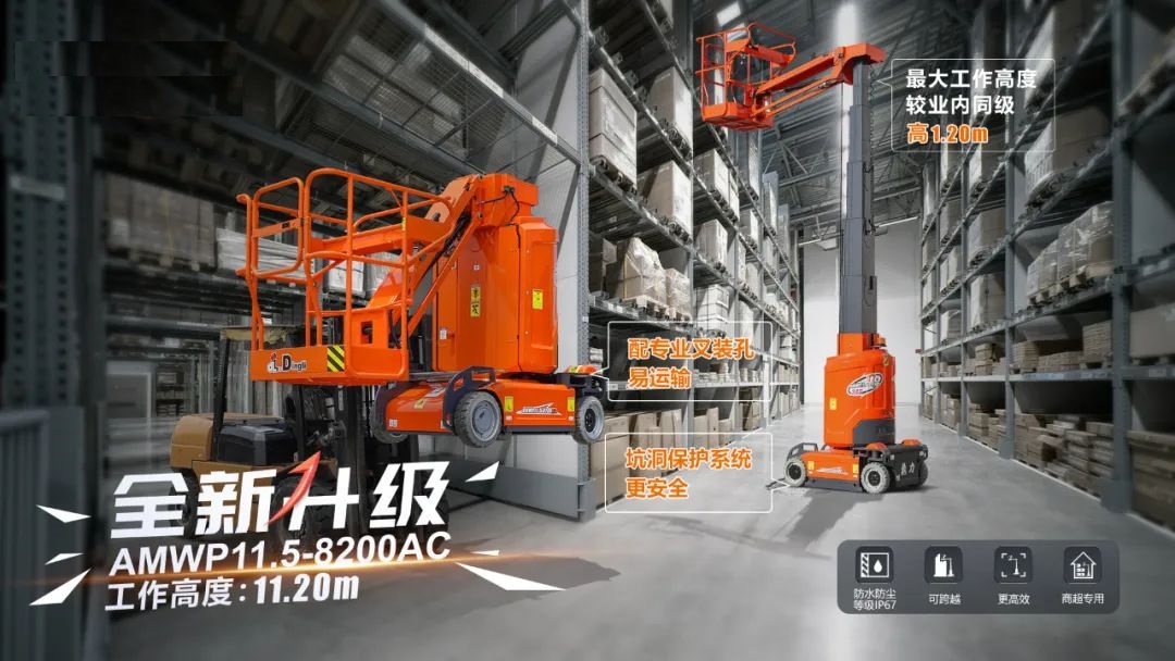 交流套筒式高(gāo)空(kōng)作(zuò)業(yè)平台AMWP11.5-8200AC,工(gōng)作(zuò•πσ)高(gāo)度11.2m,荷載200kg,整機(jī)搭載全封閉式交流系統,α→<♥純電(diàn)驅動,适合倉庫、超市(shì)等€π'≤狹窄通(tōng)道(dào)的(de)高(gāo)空(kōnβ™↓★g)作(zuò)業(yè)環境,且配置了(le)特有(yǒu)的(de)專α₹>用(yòng)運輸叉裝孔。